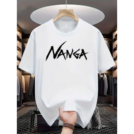 メンズ ブラック カジュアル レタープリントTシャツ - クルーネック、半袖、ストレッチニット生地、「NANGA」デザインの夏のファッショントップ、透けない素材