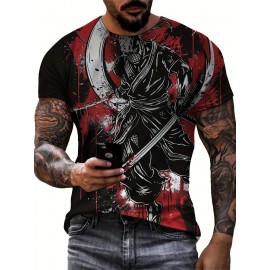 メンズ 3D サムライプリント Tシャツ、カジュアル クルーネック 半袖ティー、100% ポリエステルニットファブリック、軽いストレッチ、レギュラーフィット、夏トップ - 150gsm