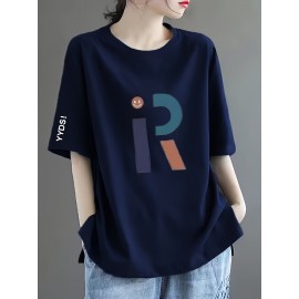 レディース ネイビーブルー 半袖Tシャツ - サマーコレクション、ゆったりフィット カジュアルトップス 抽象文字プリント ラウンドネック 軽量&通気性生地