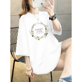 1pc 女性用カジュアル半袖Tシャツ、花柄プリント、丸首、ポリエステル、レギュラー丈、夏用ファッショ..