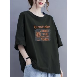 レディース ネイビーブルー 半袖Tシャツ - サマーコレクション、ゆったりフィット カジュアルトップス 抽象文字プリント ラウンドネック 軽量&通気性生地