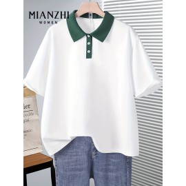 ミアンジ レディース ブラウス - 夏用 カジュアル 半袖Tシャツ コントラストカラー、ブラック&ホワイトトリム、洗濯機対応 レギュラーフィット