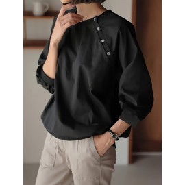 レディース ピュア ラウンドネック アシンメトリカル ボタン ディテール トップス 秋用 カジュアル 3/4袖 シンプルホワイト 光沢仕上げ 洗濯機対応 レディースTシャツ